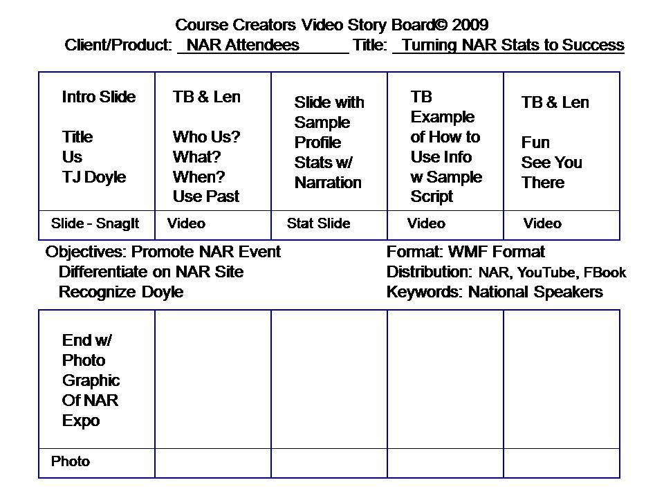 Since we produce an extensive amount of training CD’s, we realized the need for a tool that would keep us on track during the creation process. So we developed one, and we would like to share it with you. It is the Course Creators Video Storyboard!